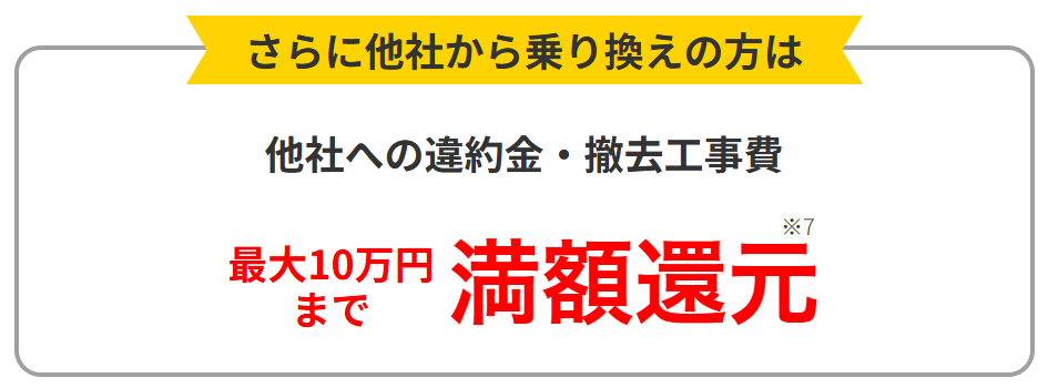 また、他の光回線からソフトバンク光への乗り換えで負担した解約違約金を10万円まで負担してくれるのも大きなポイントです。さらに、工事料は実質無料です。